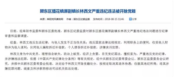 林西文身为中共党员,理想信念缺失,政治上蜕变,经济上贪婪,目无党纪国法,擅权妄为,严重违反党的纪律,并涉嫌违法犯罪,依据《中国共产党纪律处分条例》等有关规定,经中共颍东区纪委常委会议、颍东区监委委务会议研究,并报中共颍东区委常委会批准,决定给予林西文开除党籍处分,按规定取消其退休待遇;收缴其违纪所得;将其涉嫌犯罪问题、线索及所涉款物移送司法机关依法处理。