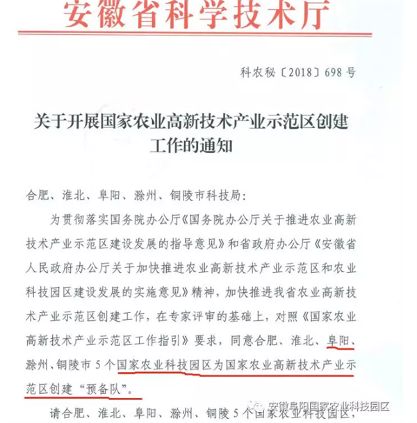 阜阳国家农业科技园区继成功通过科技部验收后,再传喜讯。12月3日,省科技厅下发《关于开展国家农业高新技术产业示范园创建工作的通知》科农秘[2018]号,阜阳国家农业科技园区入围国家农业高新技术产业示范区创建“预备队”。