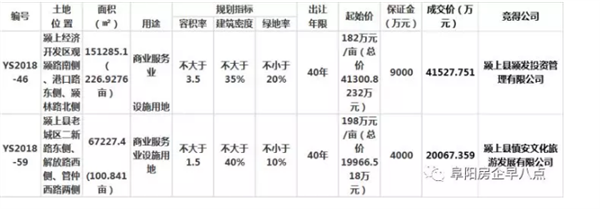 1、YS2018—46号地位于颍上经济开发区观颍路南侧、港口路东侧、颍林路北侧,面积:151285.1平方米(合226.9276亩),用途:商业服务业设施用地,出让年限:40年。20天的公告和10个工作日的挂牌期满后,颍上县颍发投资管理有限公司以41527.7508万元竞得该宗国有建设用地使用权;