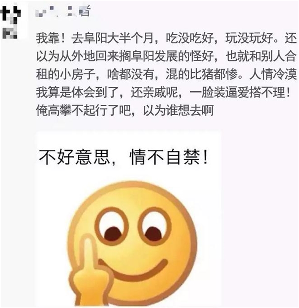 半个月过去,表妹没找到合适工作,只能拖着行李回了颍上。昨天正想问她安全到家没,却看到她发出的这样一条朋友圈(没有屏蔽我)……