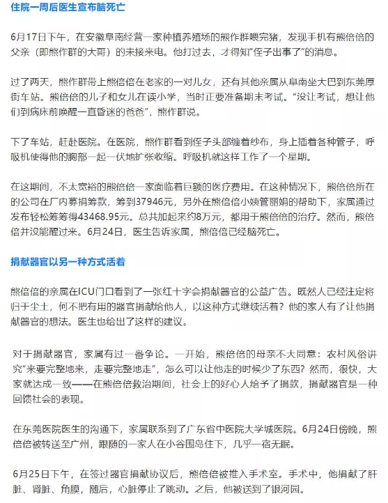 在捐献了肝脏、肾脏、角膜后,31岁的打工男子熊倍倍获得了属于他人生的最后一份荣誉。