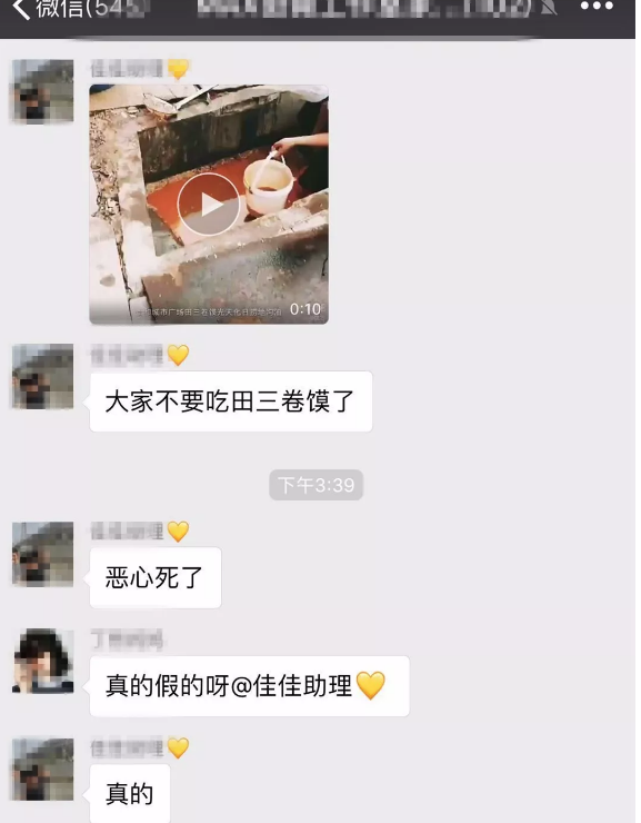 记者看到该视频持续10秒钟,在一处田三卷馍店面门口,两位身穿工作服的员工正在处于池子旁边,用白色塑料桶挖出一层厚厚的废渣油。在视频下端一行字体为“怡和城市广场田三卷馍光天化日捞地沟油”。