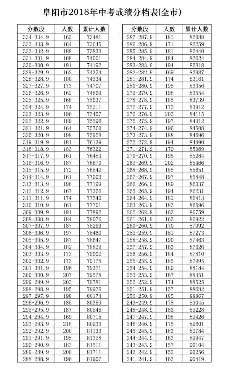 阜阳市2018年中考成绩分档表、普通高中招生建档线出炉