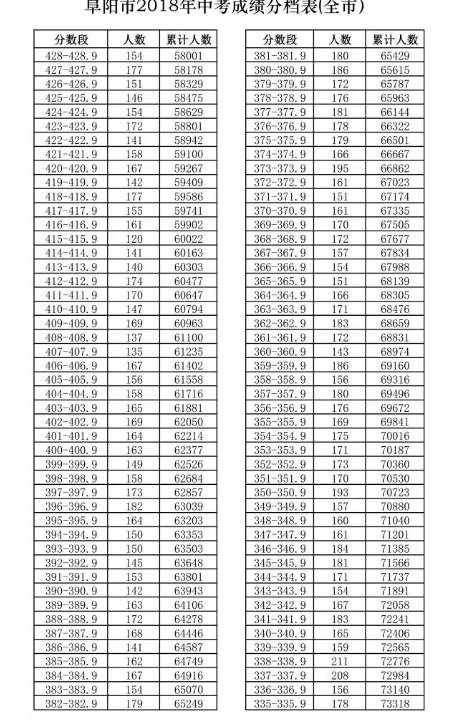 2018年阜阳市中考学生成绩,分档表新鲜出炉,快来看看你家孩子排在多少名!我市2018年普通高中招生建档线公布,最高分490分,最低分330分。各个县市区普通高中招生建档线如下:阜城三区450分、 临